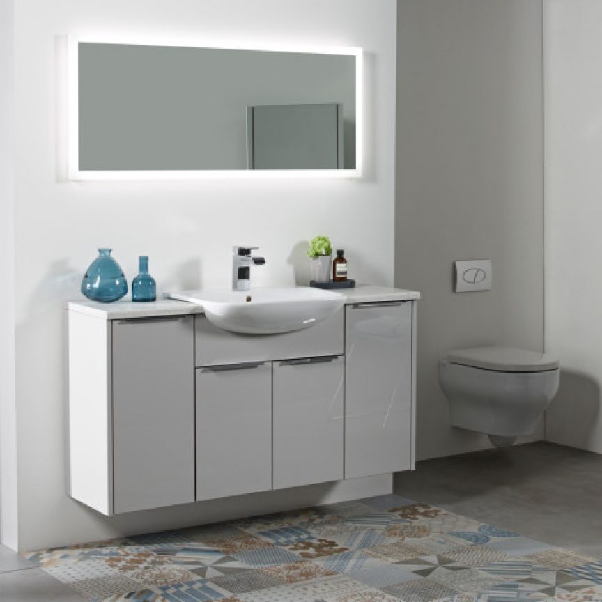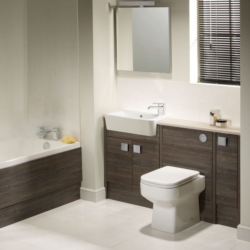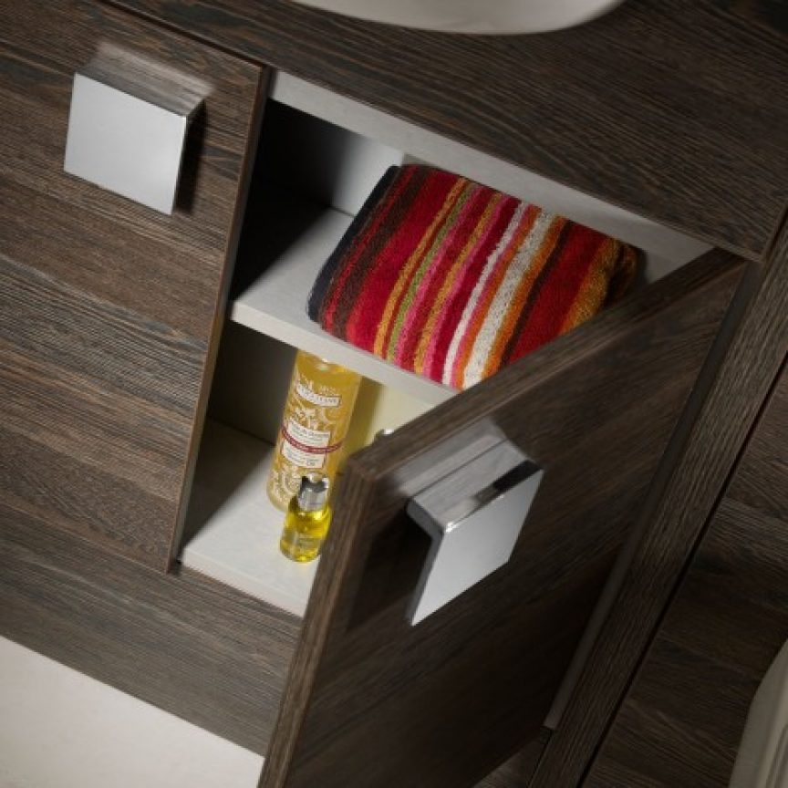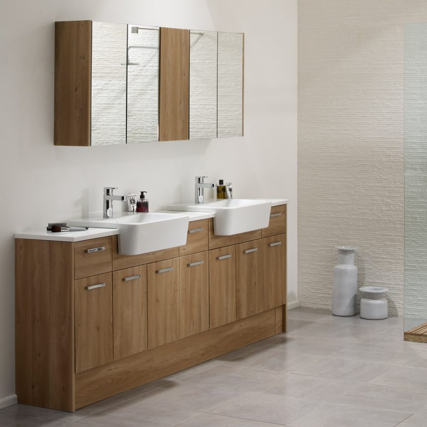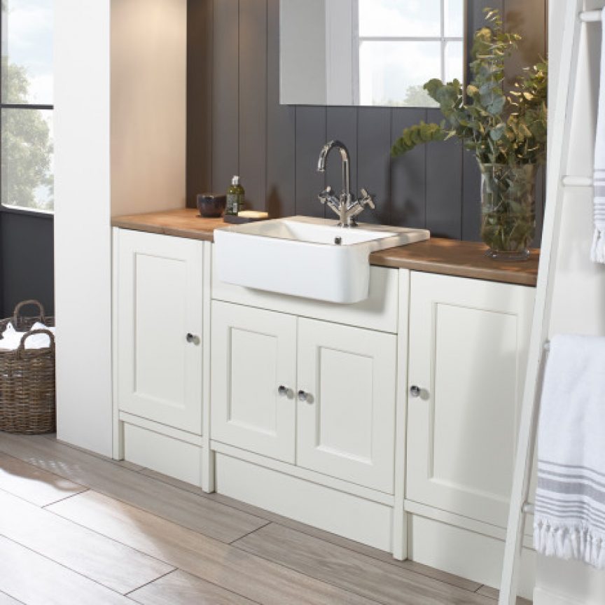 An increasingly popular option for increasing storage in bathrooms is fitted furniture. Much like you’d find in your kitchen, fitted bathrooms produce a clean, uncluttered appearance, with a worktop, plenty of storage space and matching units. An additional benefit is that the void underneath the furniture run (behind the plinth) can conceal a vast amount of unsightly pipework. It is a range of furniture that can be installed into pretty much any width and can be seamlessly wall to wall with the use of filler panels (cut to size panels the same finish as the doors) and worktop lengths and plinths that can be trimmed to the exact required length.