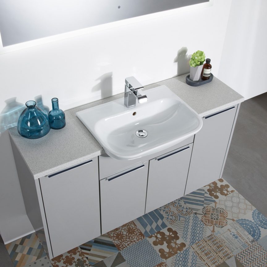 Semi-countertop basins (also known as semi-recessed) sit half in & half out of a countertop or worktop and are usually used with fitted furniture. The basin will be in contact with the worktop over a larger area and the tap may will be fixed onto the basin or, like the vessel basin, can be mounted next to the basin on the countertop or on the wall behind (a no tap hole basin would be required which is more rare).